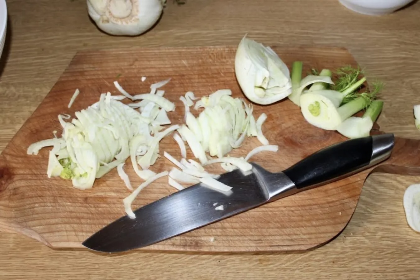 Fenkuła przekrój na pół, a następnie wykrój głąb.