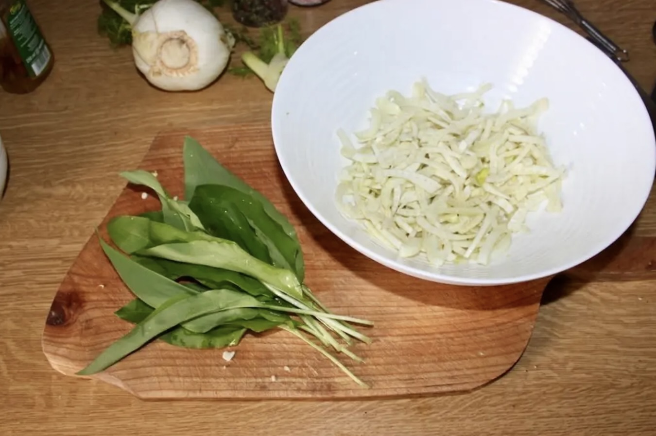 Jeśli używasz czosnku niedźwiedziego (lub rukoli/szpinaku), posiekaj go, a następnie dodaj do pokrojonego fenkuła.