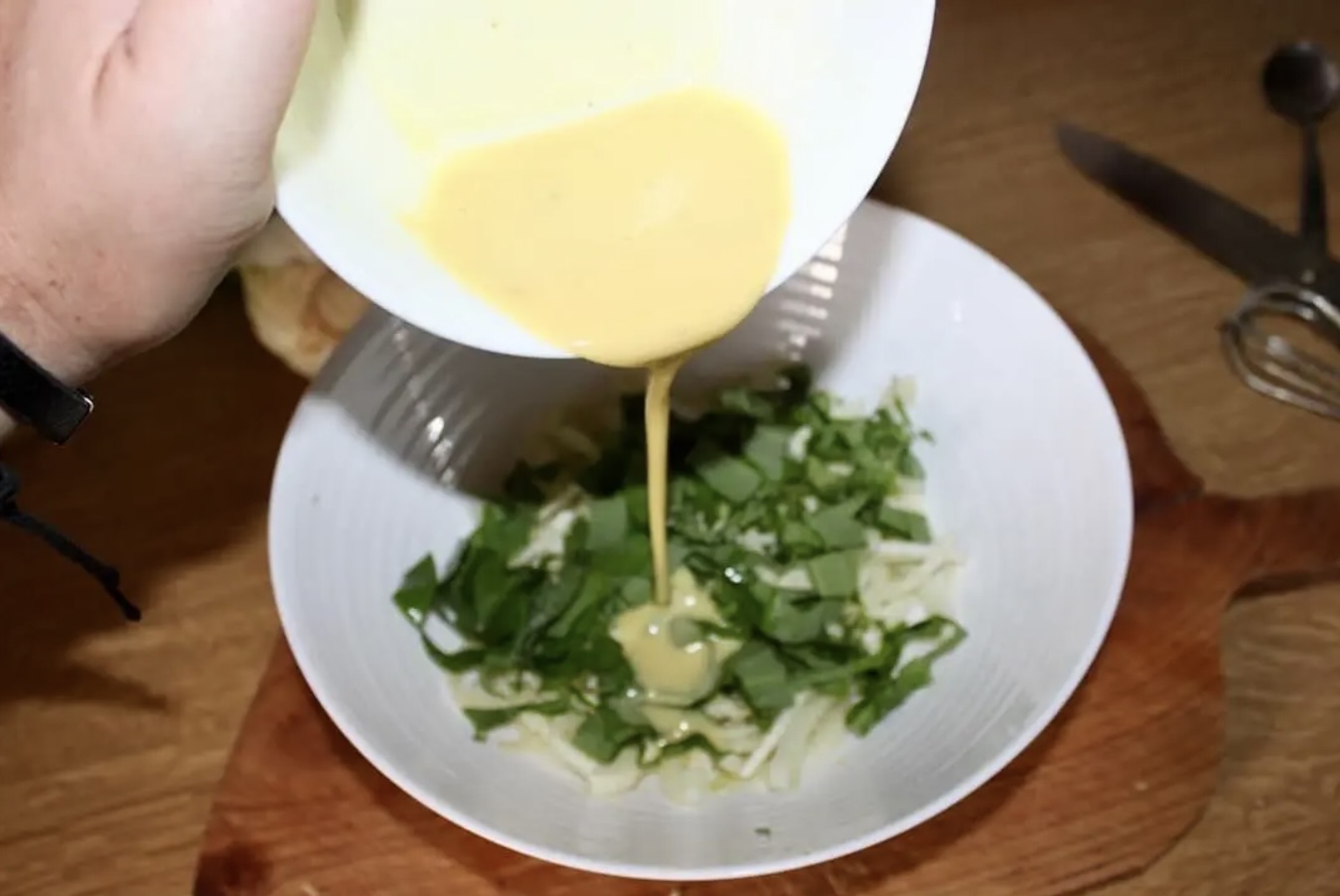 Powoli wlewaj oliwę, ciągle mieszając, aż składniki połączą się w gęstą emulsję.