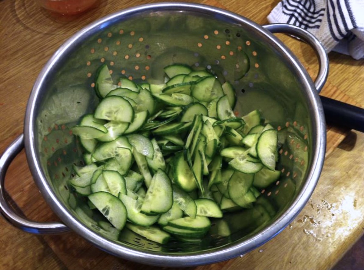 Odsączanie: Ogórki dość sporo posól (około 3 łyżeczki soli). Durszlak umieść nad głębokim talerzem, aby mogła do niego spływać woda. Pozostaw ogórki w ten sposób na około 1 godzinę, aby puściły jak najwięcej wody.
