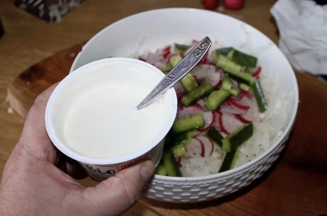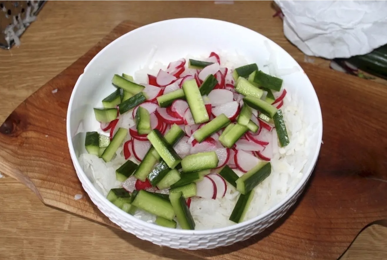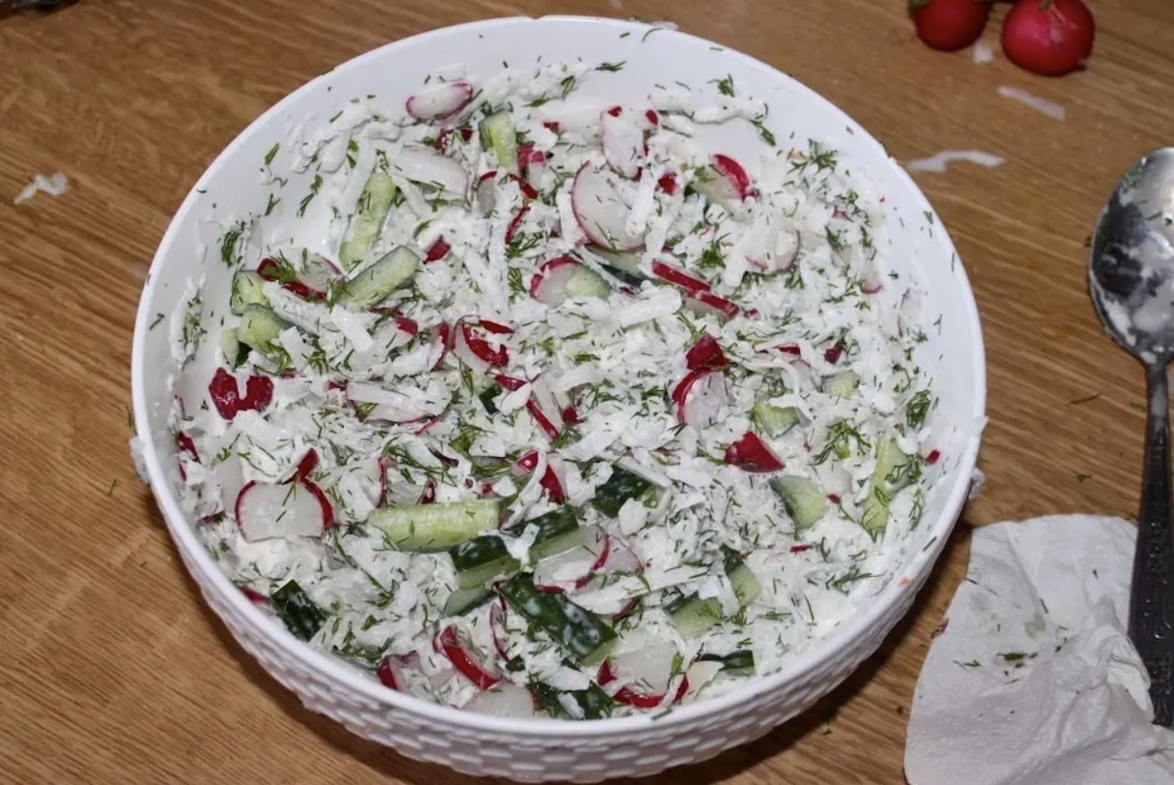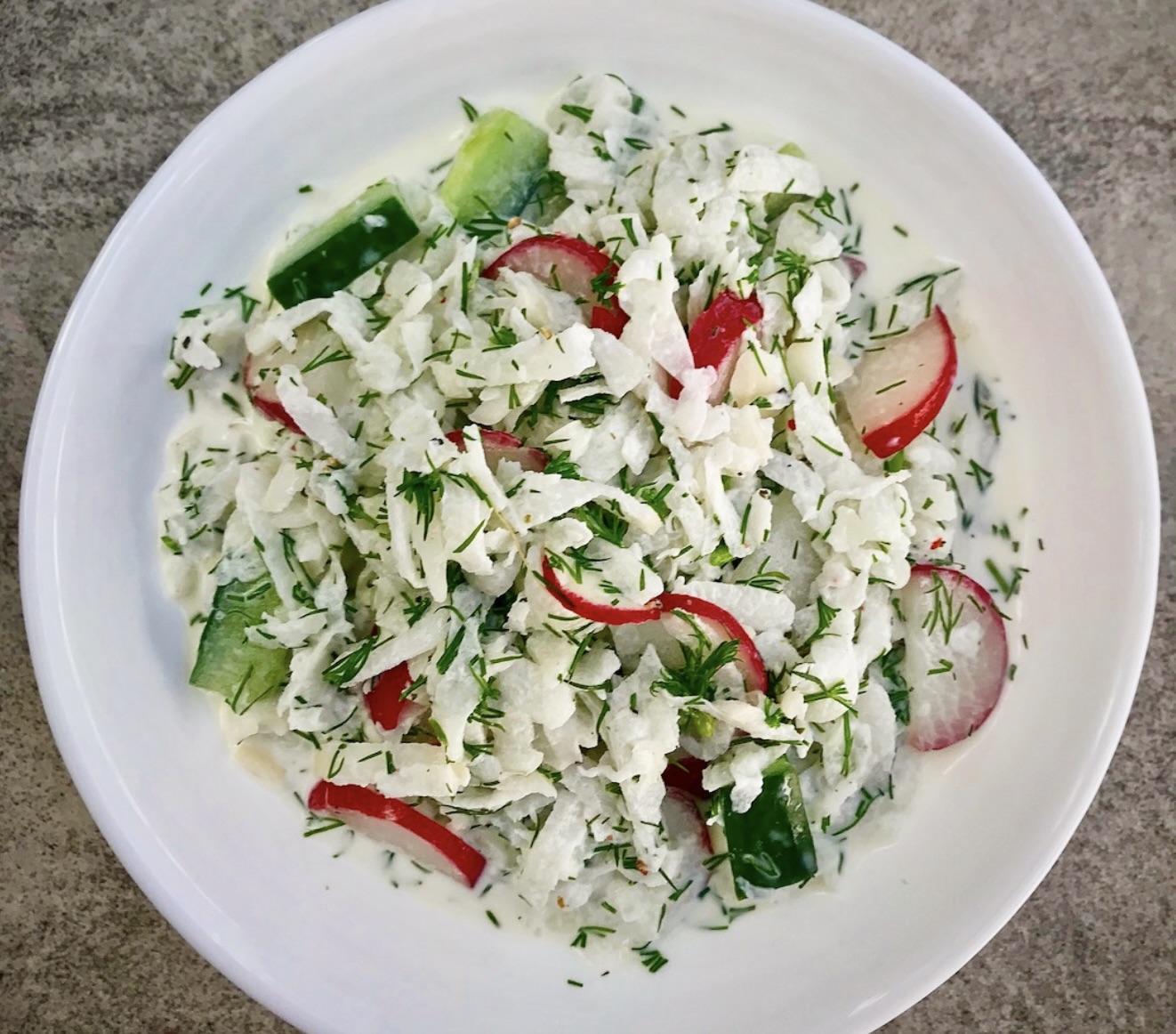 Ta surówka łączy dwa rodzaje rzodkiewki ze świeżym ogórkiem, doprawione kwaśną śmietaną i świeżym koperkiem.