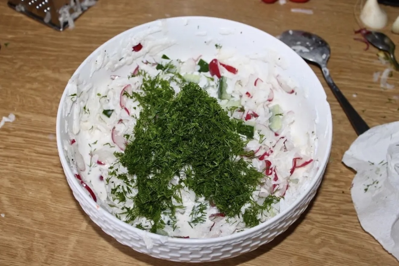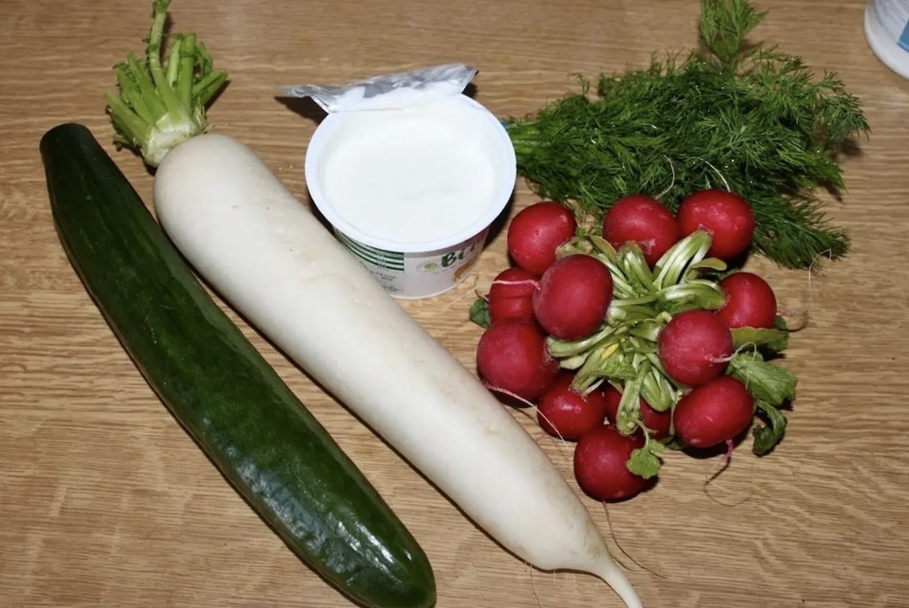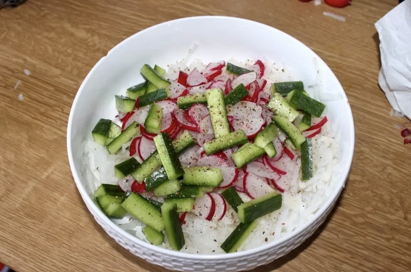 Ta surówka łączy dwa rodzaje rzodkiewki ze świeżym ogórkiem, doprawione kwaśną śmietaną i świeżym koperkiem.