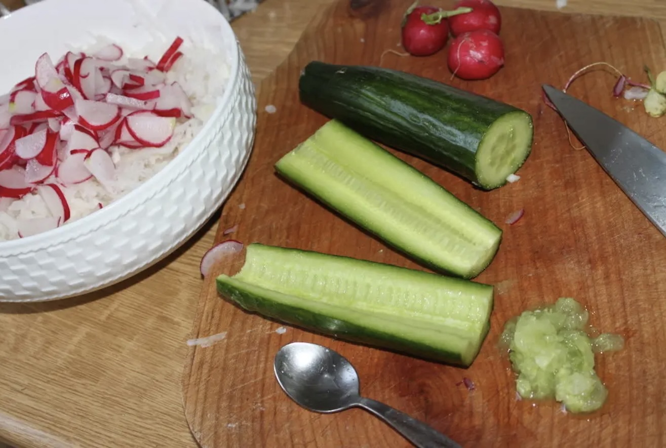 Przygotowanie ogórka: Umyj i osusz ogórka. Przekrój go wzdłuż na ćwiartki. Małą łyżeczką wydrąż pestki. Pokrój ogórka w dowolne kawałki, a następnie wrzuć do miski z rzodkiewkami.