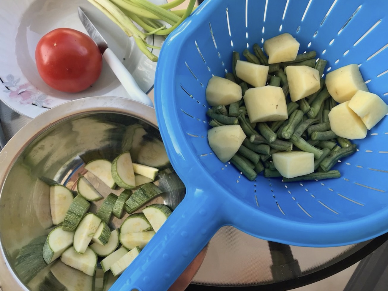 Gdy ziemniaki i fasolka są al dente, wrzuć do garnka mieszankę pomidorów i cukinii.