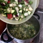 Pokrój warzywa: szpinak drobno, cukinię grubiej, bakłażana i resztę w kostkę (można „byle jak” – różne tekstury wzbogacają zupę).