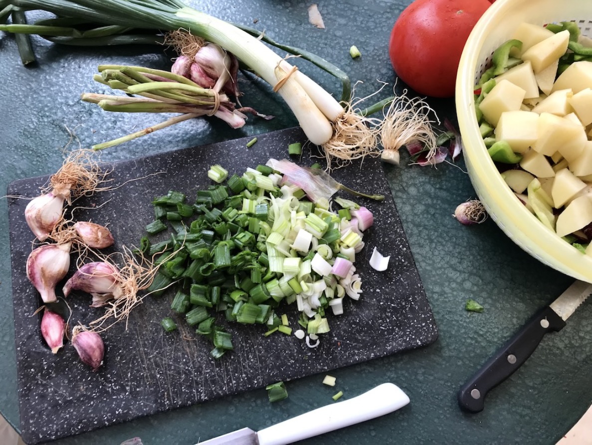 Warzywa: cukinia, papryka, pomidory (lub przecier pomidorowy poza sezonem), ziemniaki, mały bakłażan, cebula, dymka, czosnek.