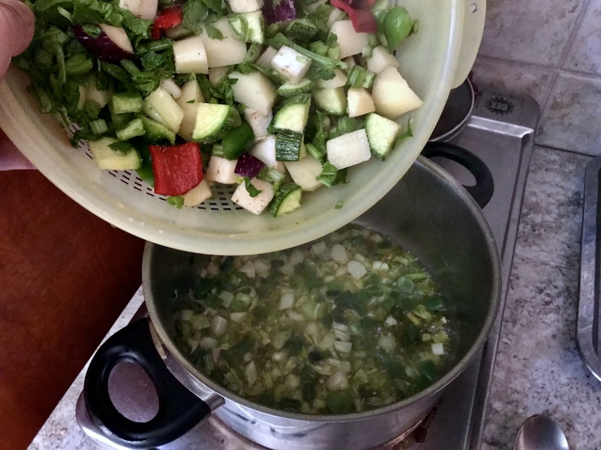 Pokrój warzywa: szpinak drobno, cukinię grubiej, bakłażana i resztę w kostkę (można „byle jak” – różne tekstury wzbogacają zupę).