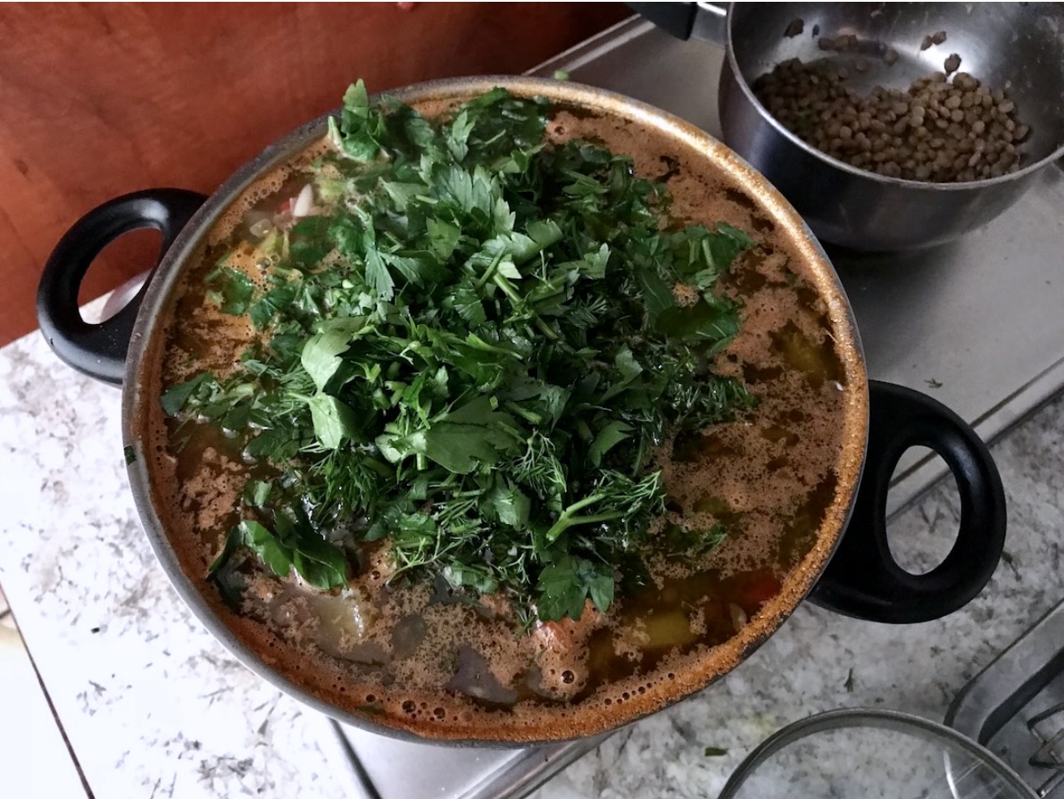 Wyłącz gaz, dodaj 1-2 łyżki świeżej oliwy extra vergine oraz dużą ilość posiekanej natki i koperku. Zamieszaj i podawaj.
