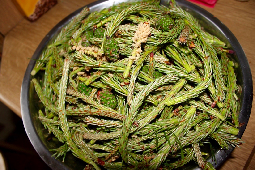 duża siatka młodych pędów sosny, świeżo zebranych;