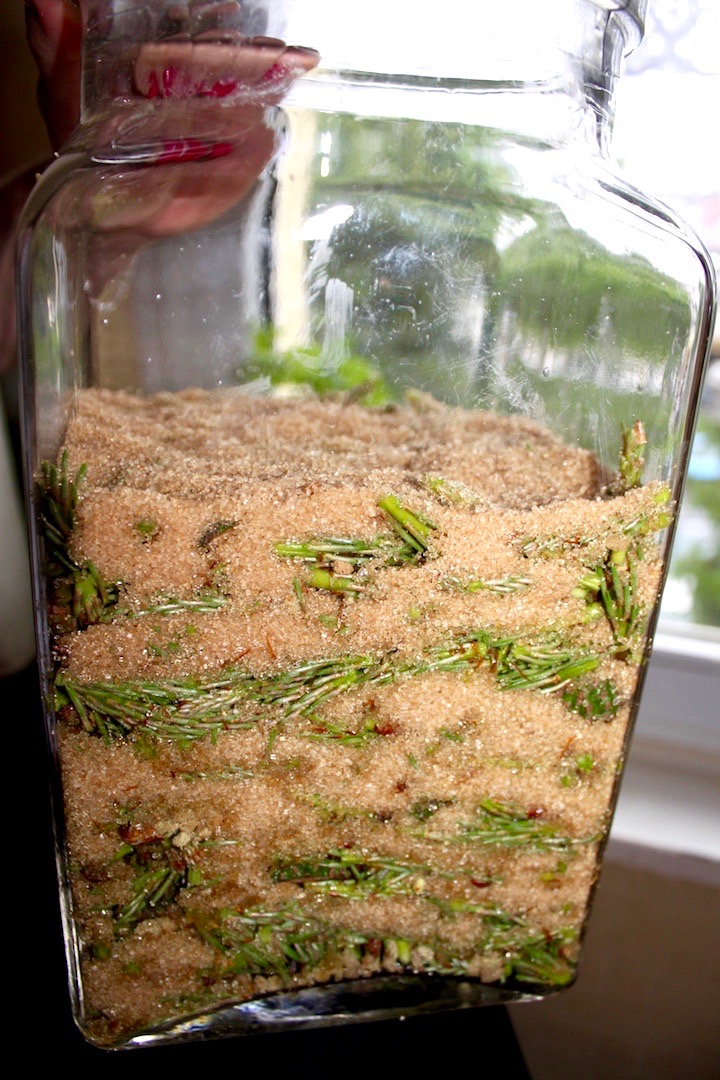 Pędy można szybko i delikatnie przelać bieżącą wodą, aby usunąć nieczystości, ale ja przyznam się nie robię tego, uważam to za czyn zbędny. Pędy połam na mniejsze kawałki, szyszki przetnij na połowę (niektórzy pędy gniotą tak, aby uzyskać z nich jeszcze więcej syropu). Tak przygotowane pędy układaj warstwami w dużym słoiku, a każdą warstwę pędów przesyp cukrem (ja wybrałem akurat cukier trzcinowy). Gdy wykorzystasz już wszystkie pędy na wierzchu pozostaw warstwę cukru.