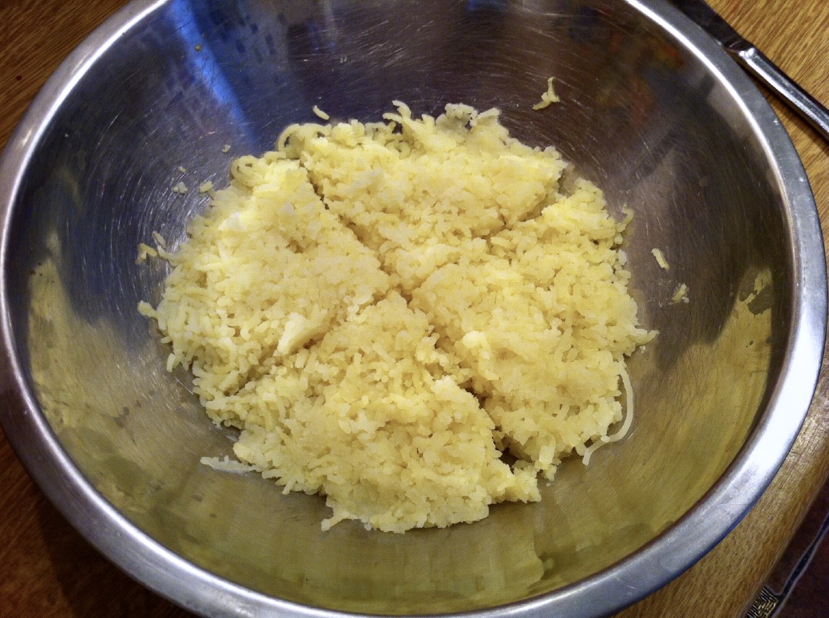 Ziemniaki surowe: 4 surowe ziemniaki zetrzyj na tarce (drobne lub grube oczka, zależnie od preferencji). Bardzo dokładnie odciśnij je przez ścierkę lub na sitku nad garnkiem.
