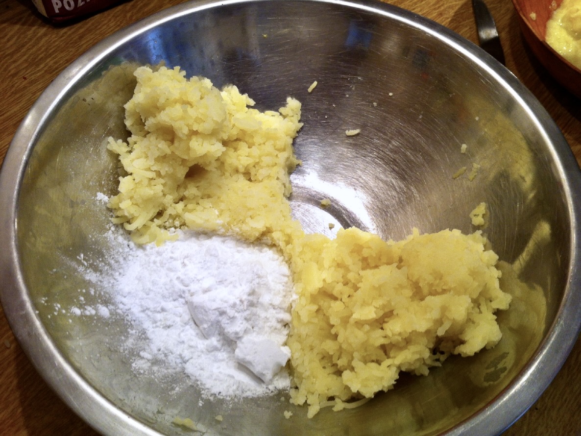 Ziemniaki gotowane: Obierz 1 kg ziemniaków, pokrój w kostkę i ugotuj. Gorące przeciśnij przez praskę do miski i odstaw do przestudzenia.