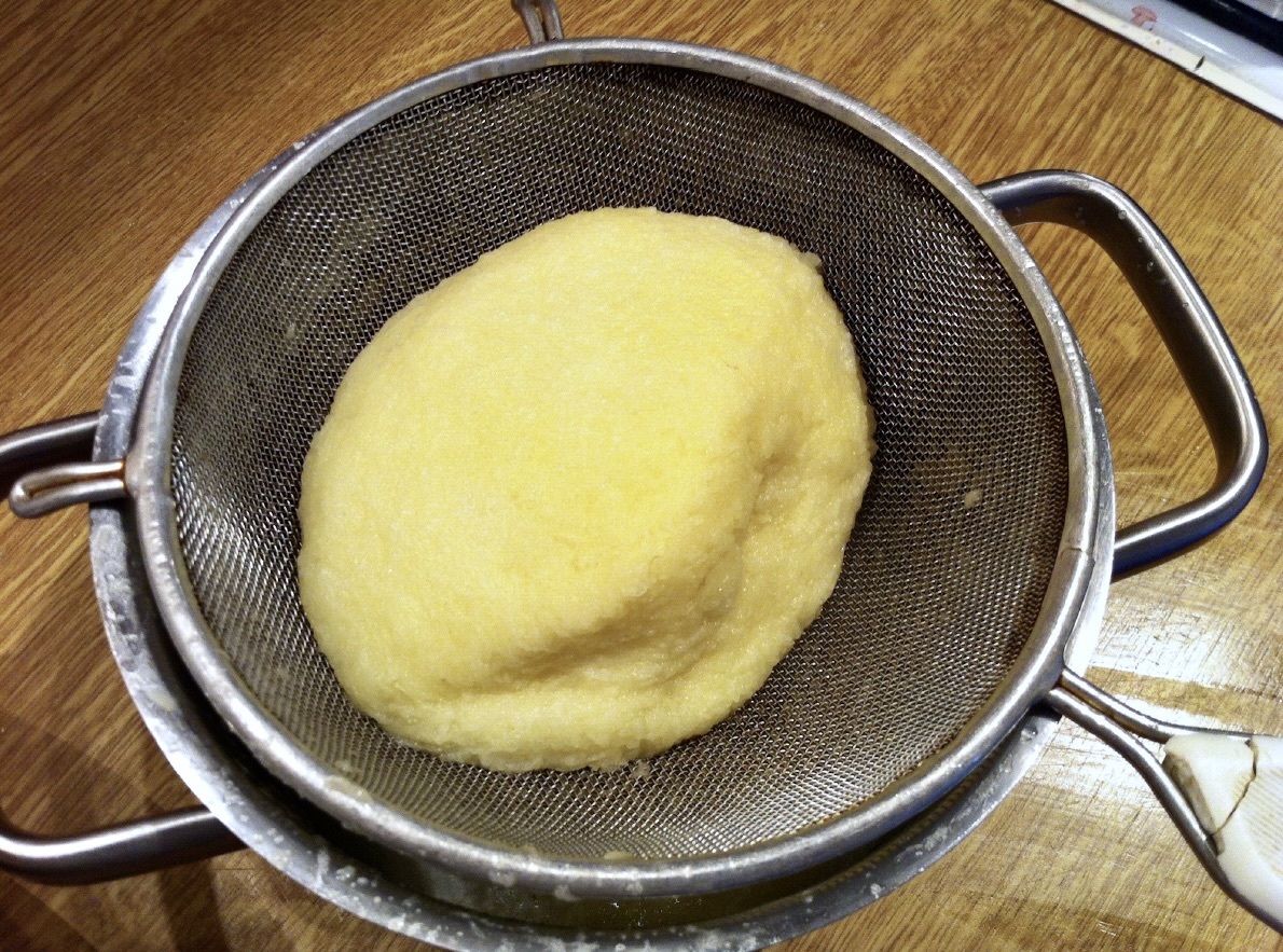 Skrobia: Odciśnięty płyn z surowych ziemniaków odstaw na 10 minut. Gdy na dnie osiądzie biały osad (skrobia), ostrożnie wylej wodę, a samą skrobię dodaj do miski.
