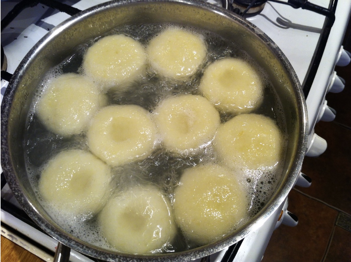 Gotowanie: Wrzuć kluski na wrzącą, osoloną wodę. Gotuj przez około 20 minut.