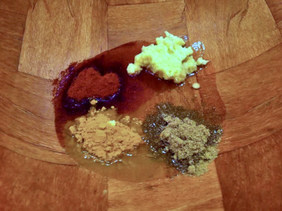 W misce wymieszaj oliwę z imbirem, papryką, kurkumą i kolendrą.