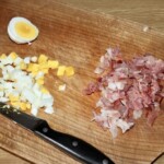 Przygotowanie dodatków: W międzyczasie obierz i drobno posiekaj jajko ugotowane na twardo. Szynkę pokrój w drobną kostkę.