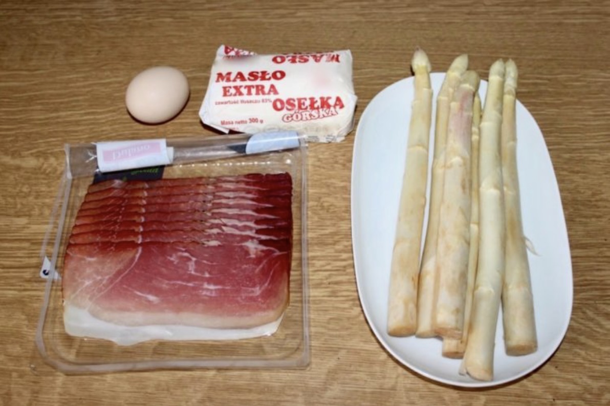Podanie: Ugotowane szparagi wyjmij z wody, osącz na ręcznikach papierowych i ułóż na talerzu. Posyp je zrumienioną szynką, obficie polej masłem z patelni, a na koniec posyp posiekanym jajkiem. Podawaj od razu, na ciepło, doprawione świeżo mielonym czarnym pieprzem.
