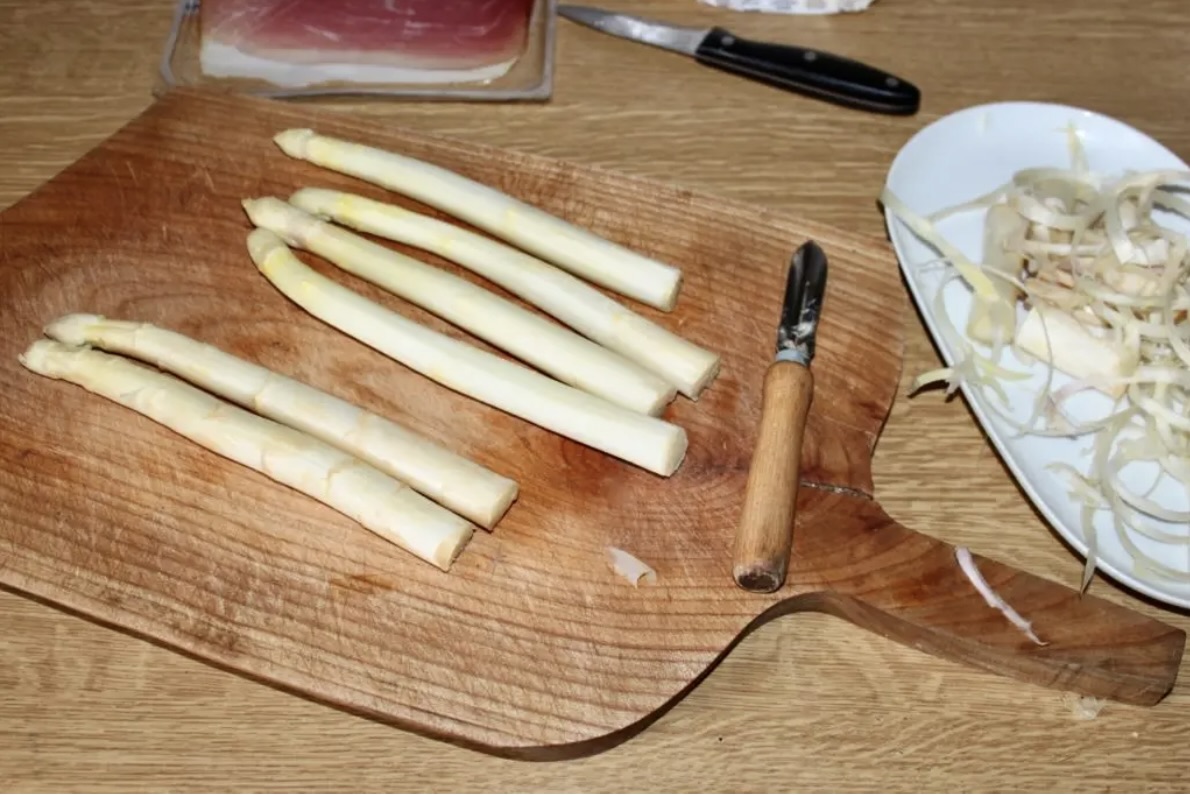 Gotowanie szparagów: Gotuj obrane szparagi na wolnym ogniu w lekko osolonej wodzie do miękkości. Zajmuje to około 10 minut, w zależności od grubości.