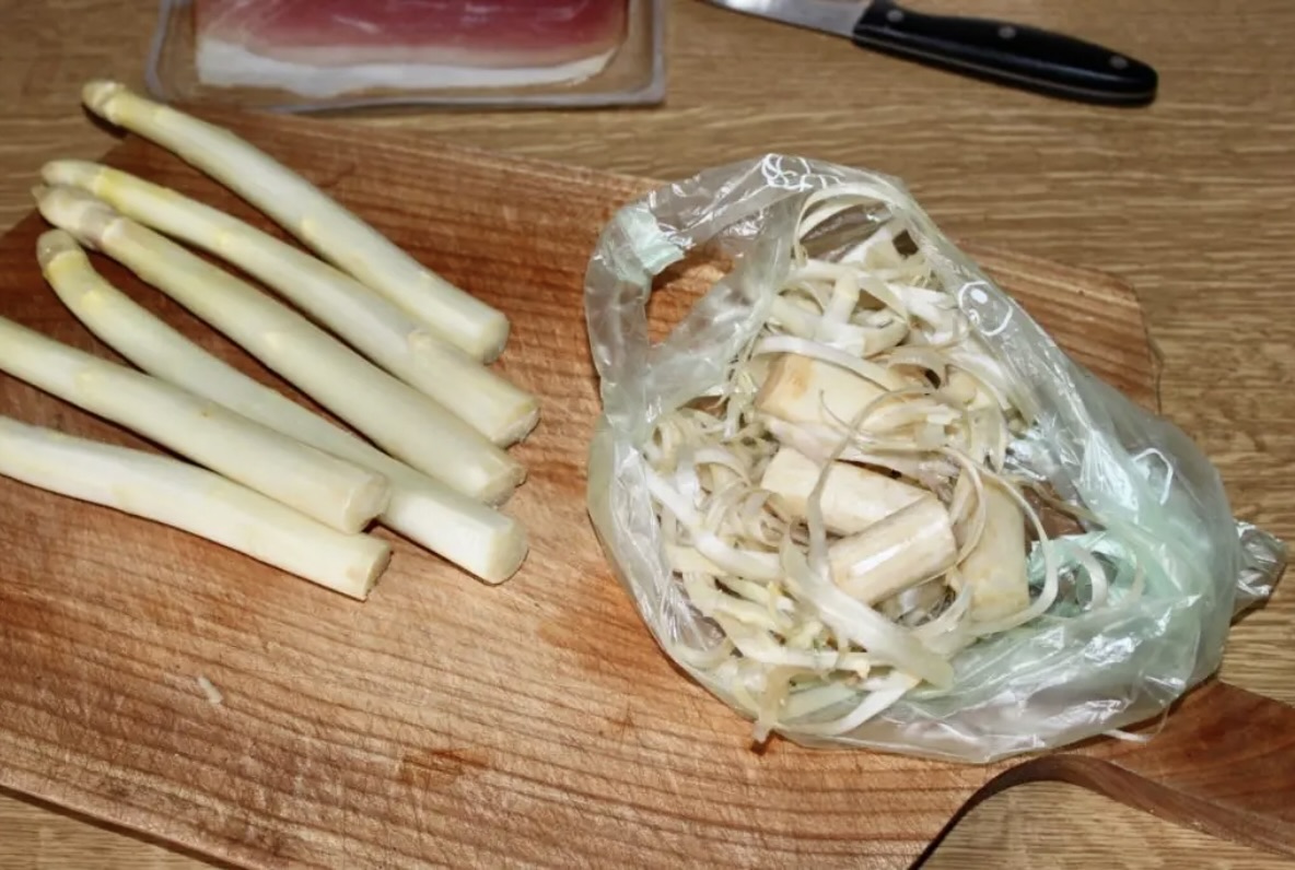 Przygotowanie szparagów: Obierz szparagi obieraczką do warzyw, pozostawiając nietknięte główki. Odetnij zdrewniałe końcówki. (Obrzyny można zamrozić i wykorzystać do przygotowania wywaru szparagowego).