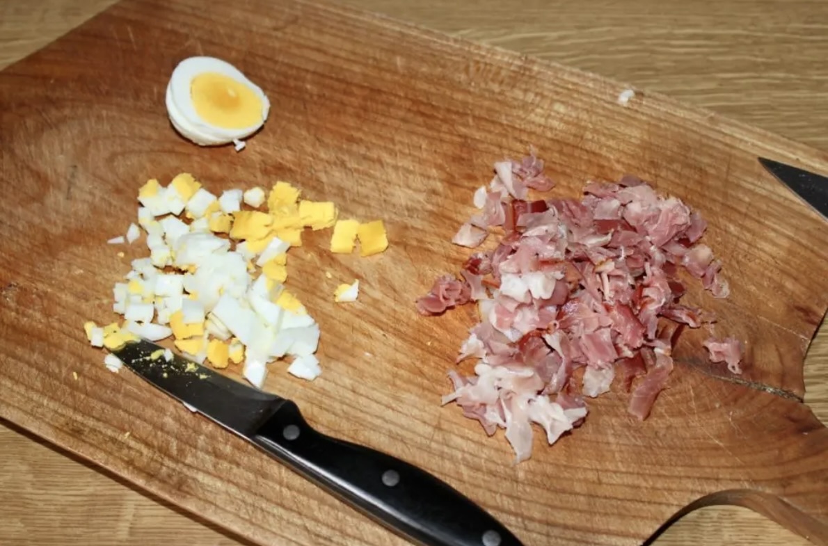 Przygotowanie dodatków: W międzyczasie obierz i drobno posiekaj jajko ugotowane na twardo. Szynkę pokrój w drobną kostkę.