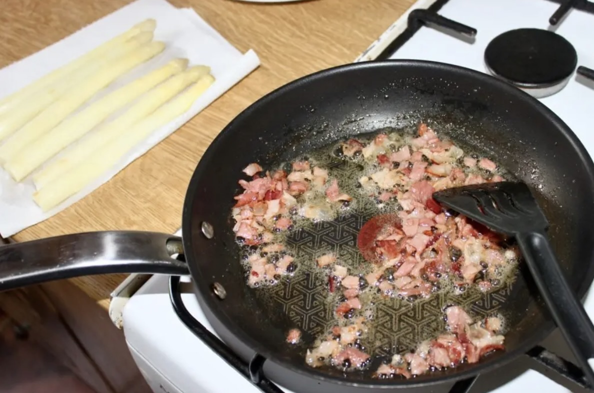 Smażenie szynki i masła: Na patelni rozgrzej masło, a następnie wrzuć pokrojoną szynkę. Smaż na średnim ogniu do jej zrumienienia. Masła powinno być wystarczająco dużo, aby móc obficie polać nim szparagi. Masło powinno się lekko przyrumienić (dla smaku), ale nie przypalić.