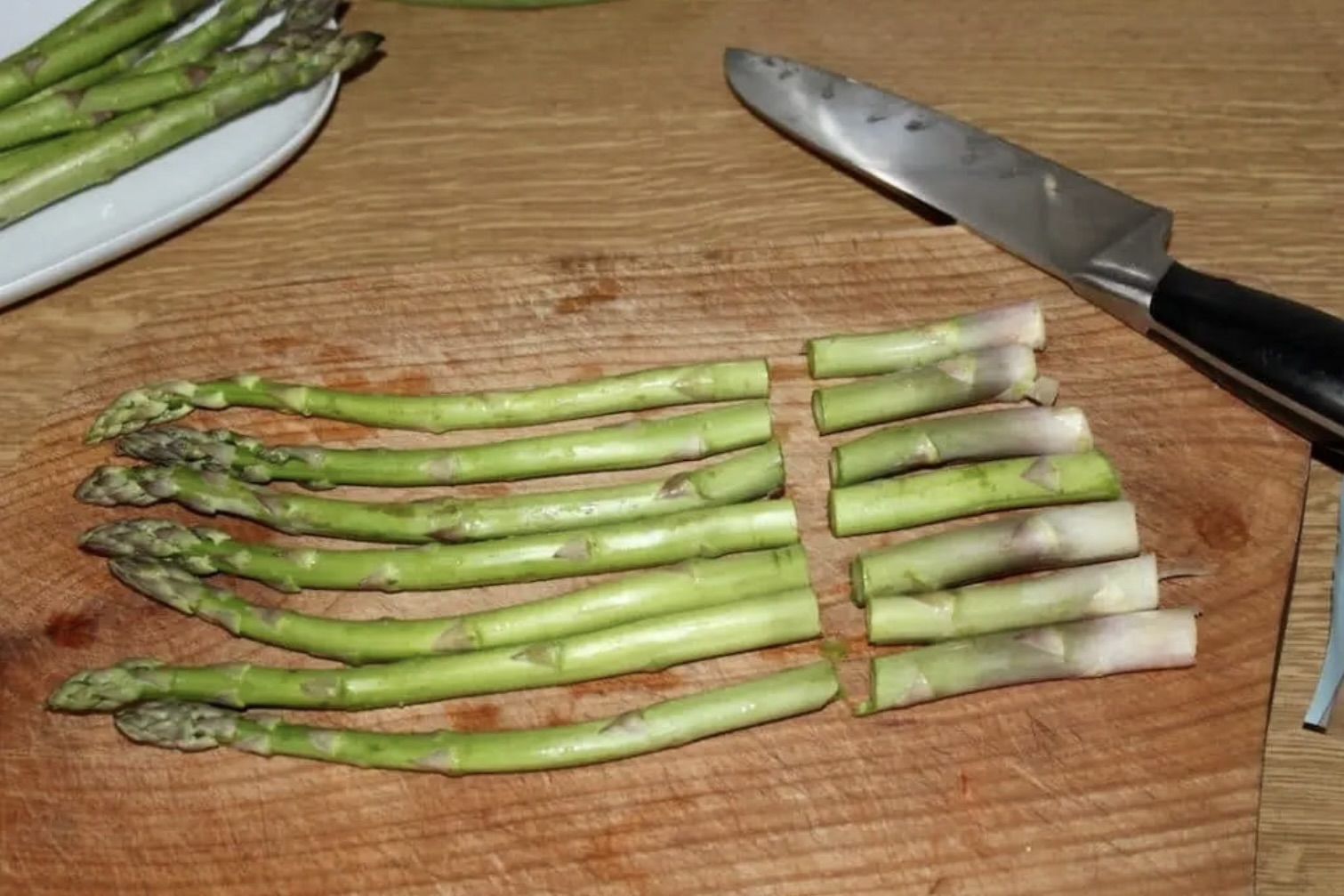 Ułóż szparagi obok siebie i odetnij zdrewniałe, białe końcówki łodyg. Końcówki możesz zamrozić na wywar.