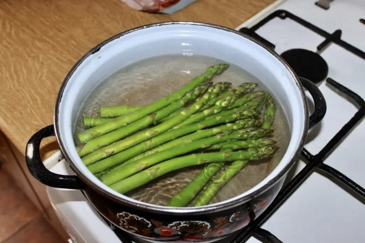 Wrzuć szparagi na gotującą się wodę, a następnie gotuj przez 5 minut od ponownego zawrzenia wody.