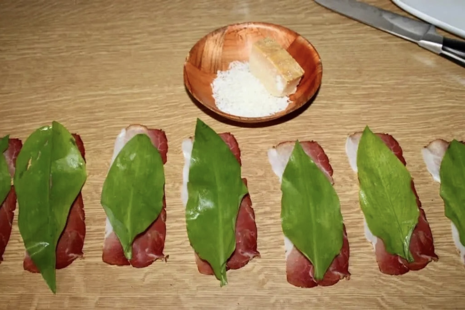 Posyp liście niewielką ilością startego parmezanu (lub ułóż płatki parmezanu).