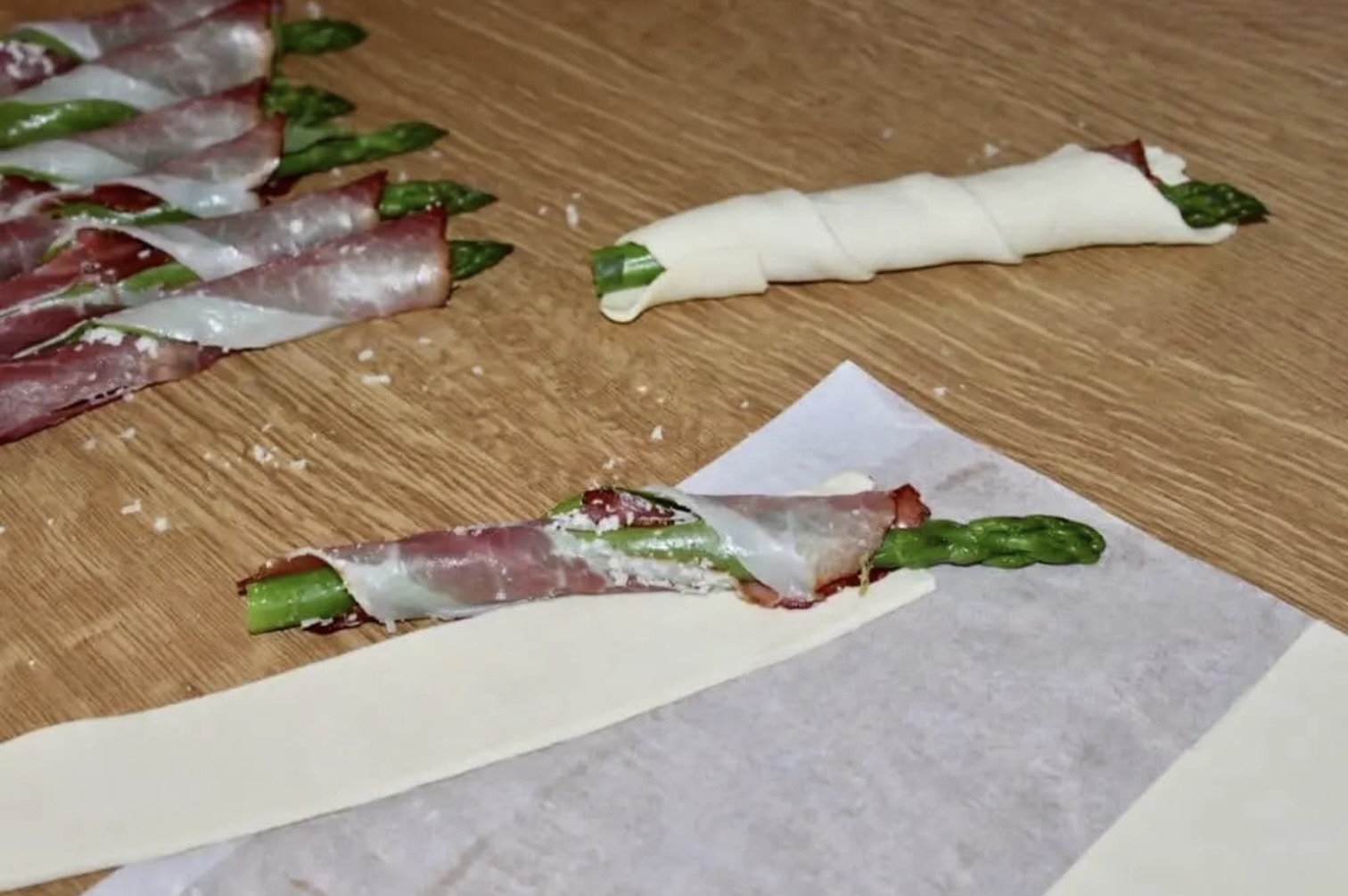 Szparagi powinny być nieco dłuższe niż plastry szynki, tak aby główka i końcówka wystawały poza szynę i ciasto.