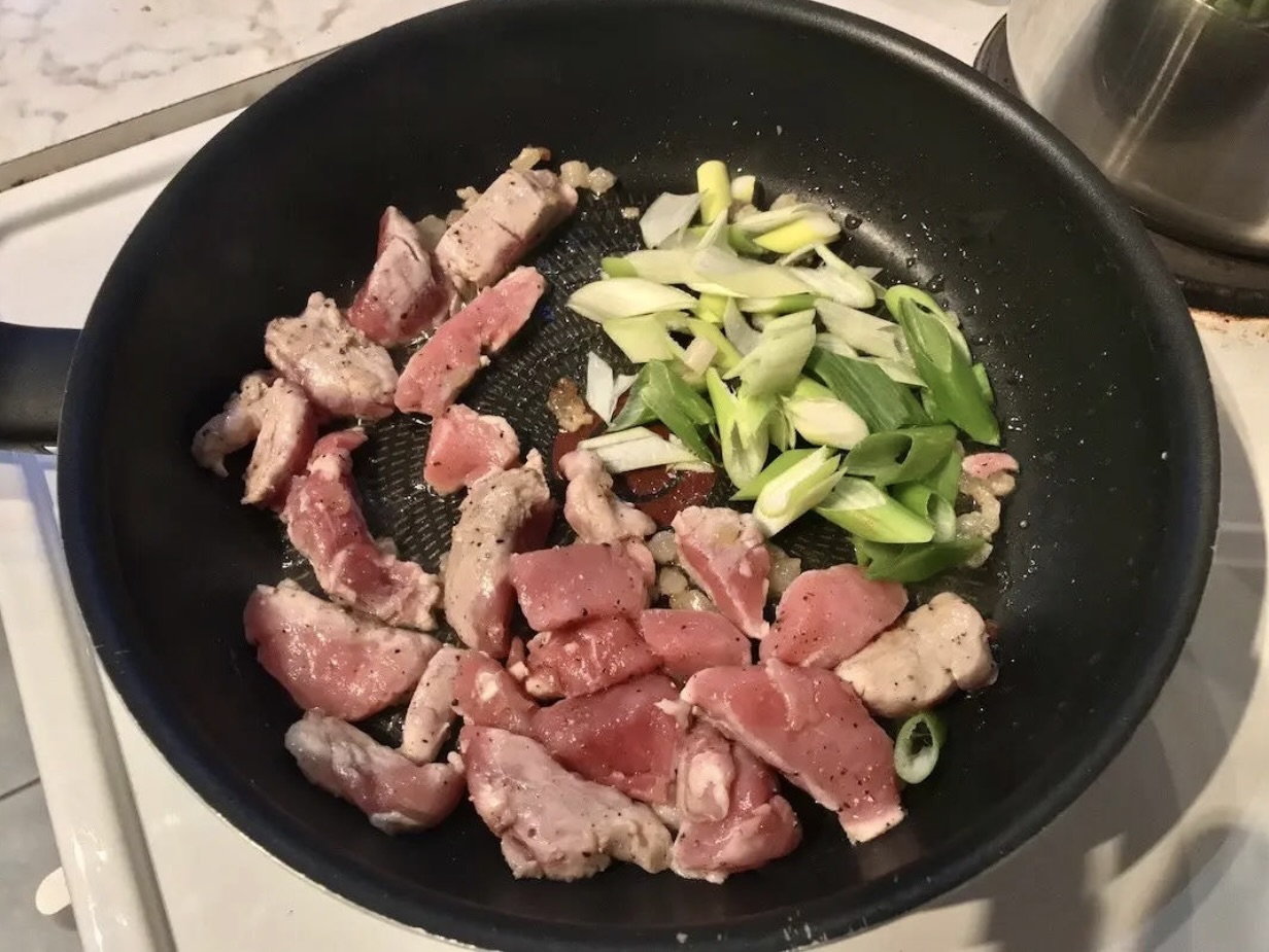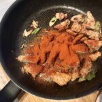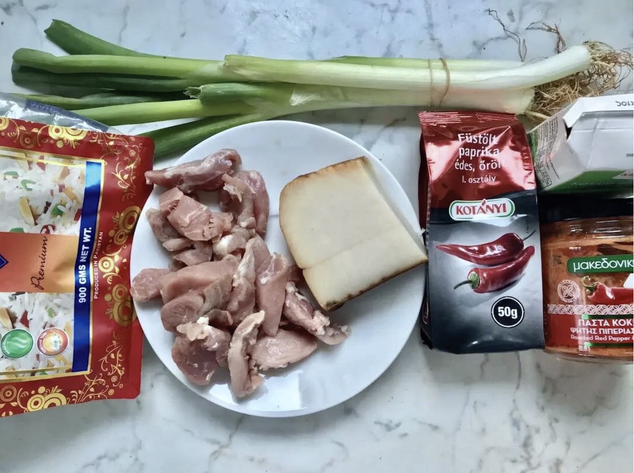 Podczas gdy ryż dochodzi pokrój w drobną kostkę mały plaster słoniny, a dymkę w centymetrowe paski. Na średnio rozgrzaną patelnię wrzuć pokrojoną słoninę i smaż krótko, aż zacznie się wytapiać. Dorzuć dymkę oraz pokrojone w paski posolone mięso. Smaż wszystko na średnim ogniu 2-3 minuty uważając, aby nie przypalić cebulki. Do przesmażonego mięsa wsyp kopiatą łyżeczkę mielonej słodkiej papryki. Zamieszaj całość i wlej pół szklanki gorącej wody. Przykryj patelnię pokrywką i duś mięso pięć minut. Szybki obiad jest prawie gotowy. Dla podkreślenia smaku na koniec wlej do dania odrobinę słodkiej śmietanki. Zagotuj.
