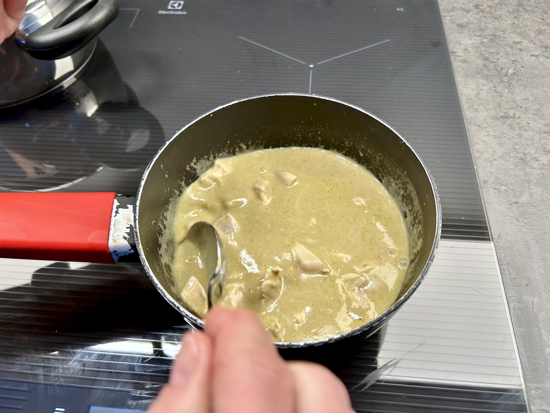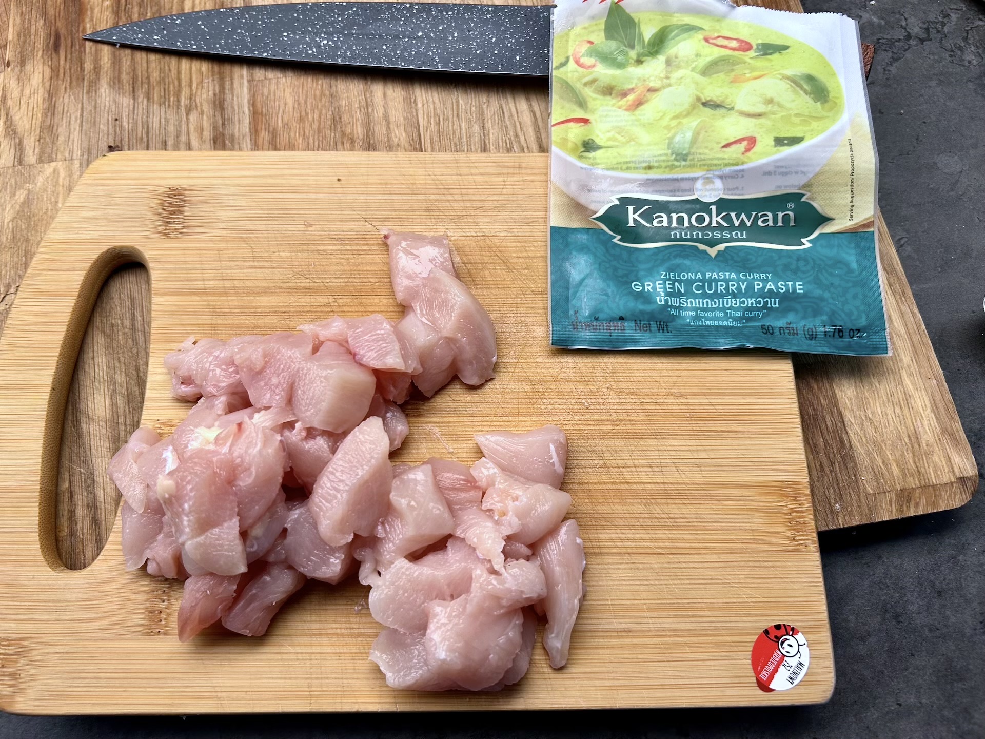 Smażenie pasty: W rondelku rozgrzej odrobinę oliwy. Dodaj dwie łyżki zielonej pasty curry i podgrzewaj ją przez chwilę, cały czas mieszając, aby uwolnić aromat (uważaj, by jej nie przypalić).