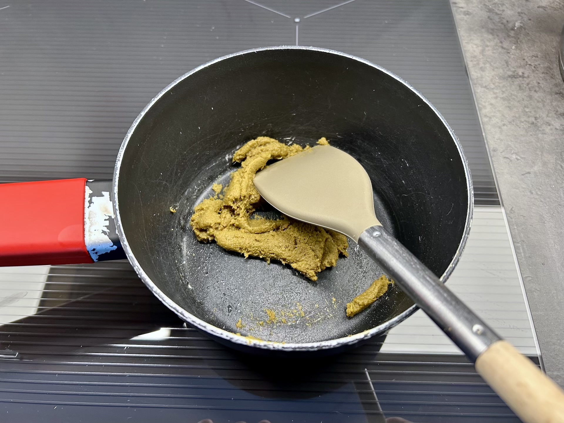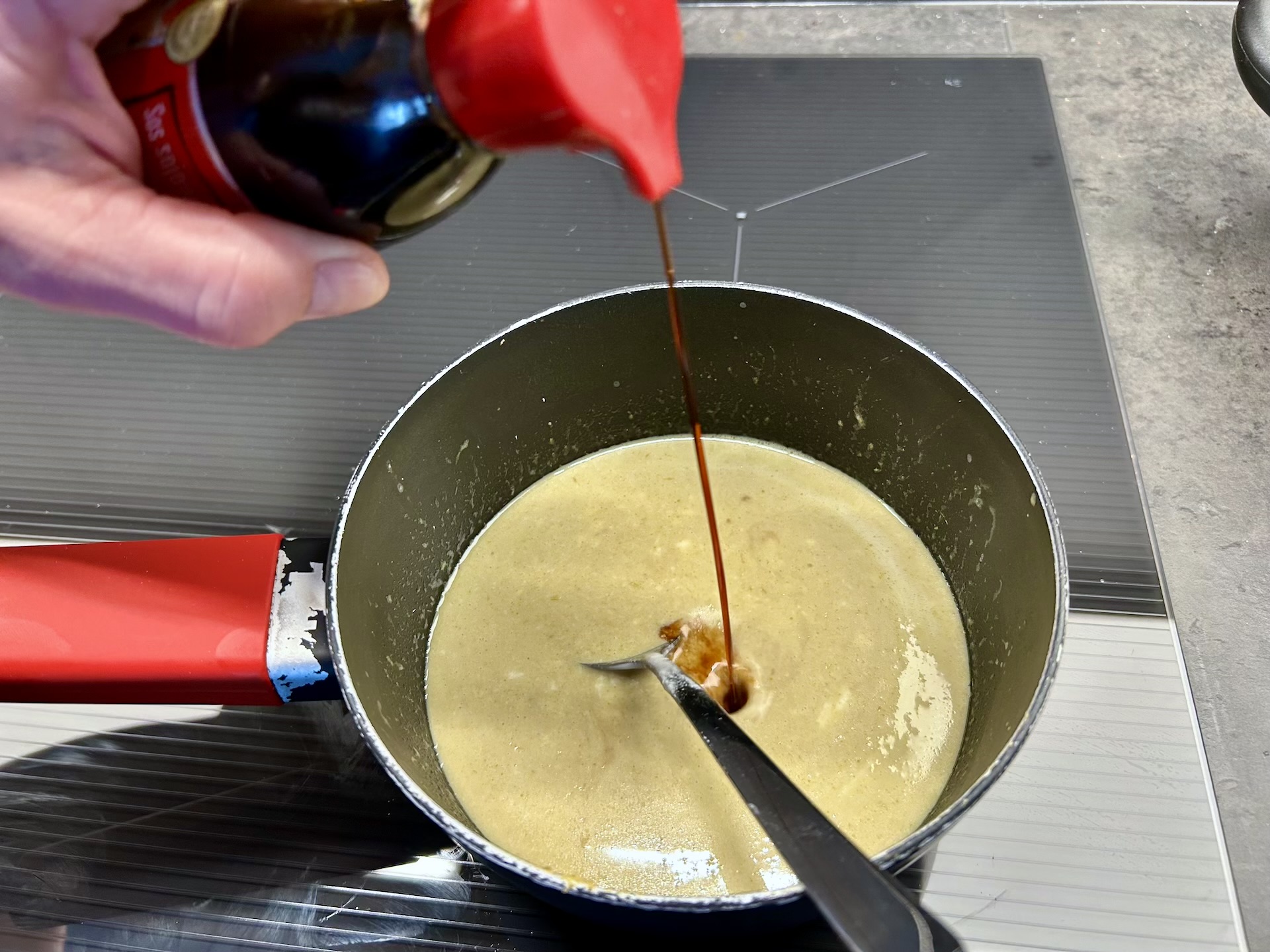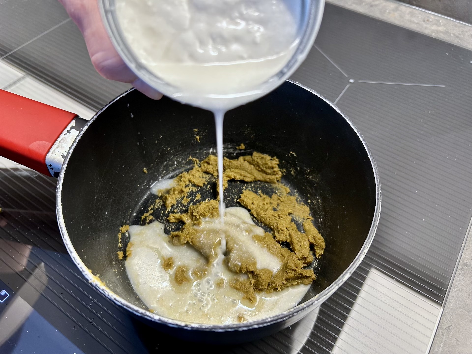 Baza sosu: Do podsmażonej pasty wlej mleczko kokosowe. Mieszaj i podgrzewaj, aż pasta całkowicie rozpuści się w mleczku.