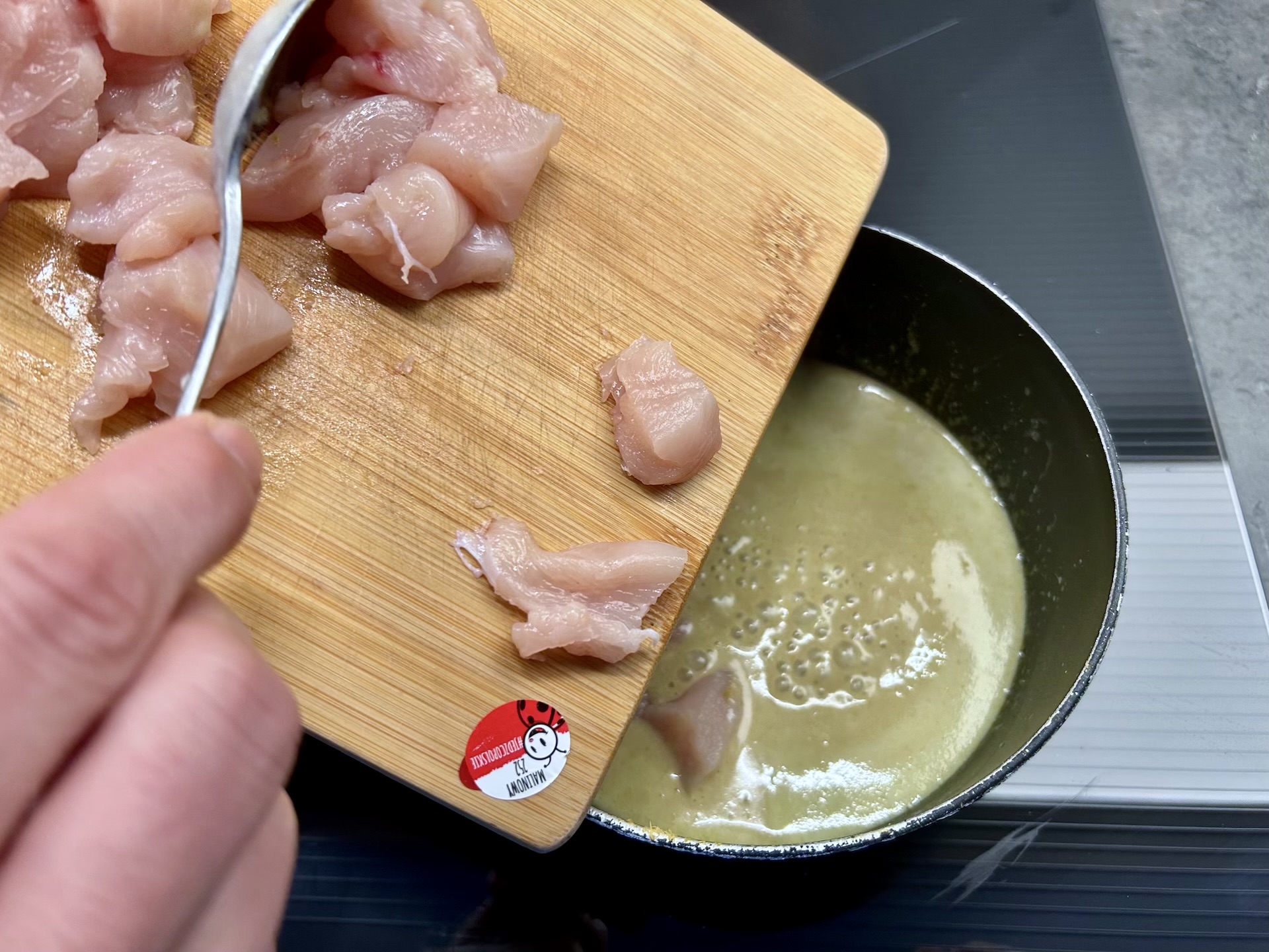 Gotowanie: Do gotującego się sosu dodaj pokrojonego kurczaka oraz po jednej łyżeczce sosu sojowego i sosu ostrygowego. Zamieszaj, przykryj rondelek pokrywką i gotuj na wolnym ogniu przez około 10 minut.