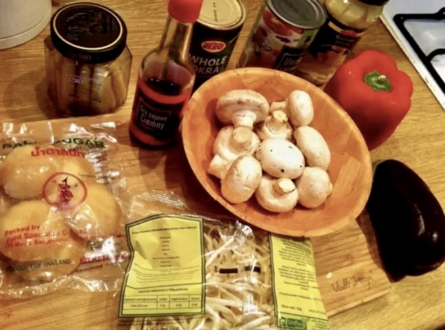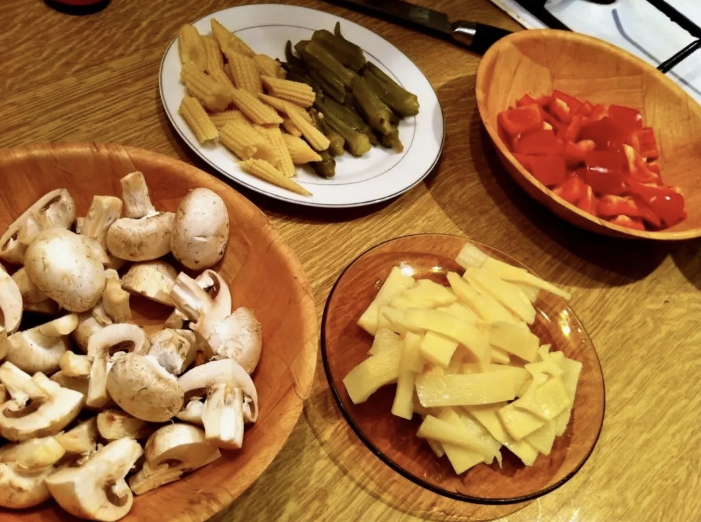 Przygotowanie warzyw: Fasolkę szparagową (lub groszek cukrowy) wrzuć na wrzątek i gotuj 3 minuty, następnie odcedź, przelej zimną wodą i odstaw. Pieczarki pokrój na kawałki, paprykę w sporą kostkę, kukurydzę na 2 lub 3 części, okrę na pół, a bambusa odcedź z zalewy. Bakłażana pokrój w kawałki podobne do pieczarek.