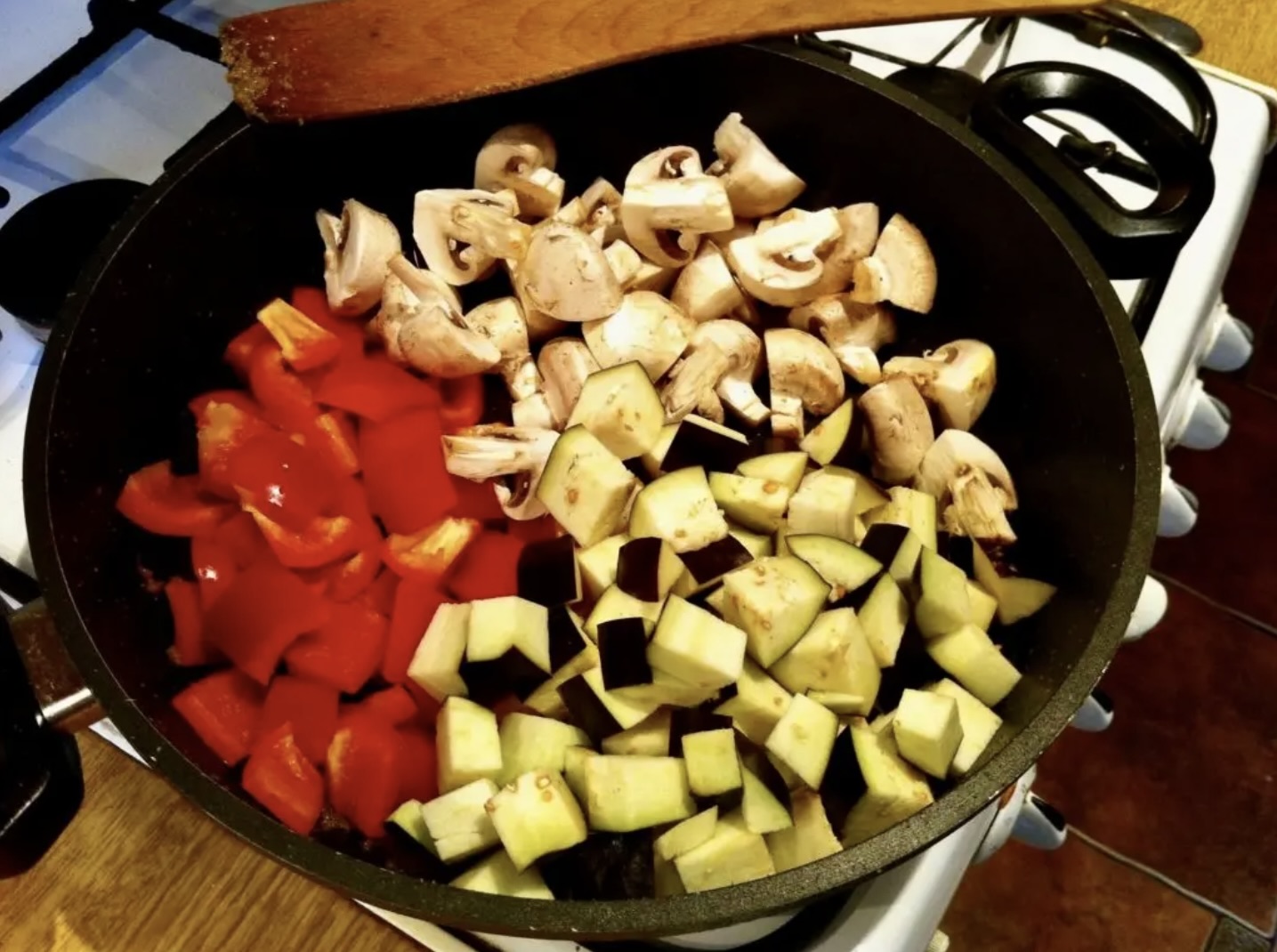 Dodanie warzyw i płynów: Wsyp pieczarki, paprykę oraz bakłażana. Dokładnie wymieszaj, aby pokryły się pastą. Wlej mleczko kokosowe (400 ml) oraz około 150 ml wody.