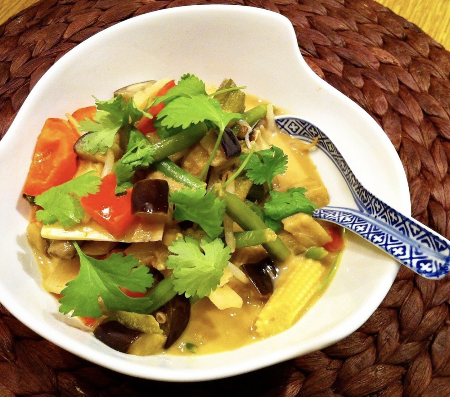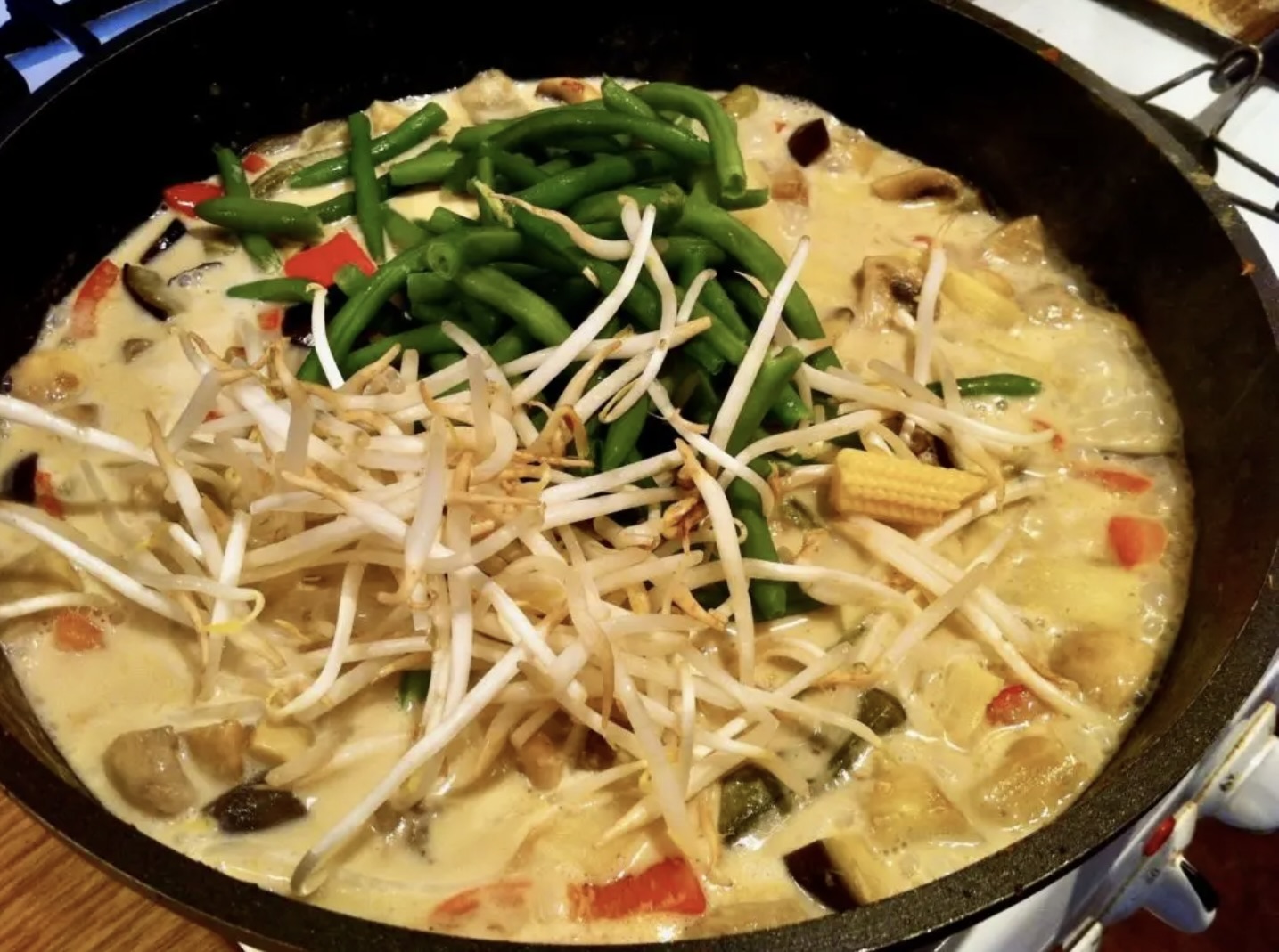 Tajskie curry przygotowuje się stosunkowo szybko. To danie niezwykle proste, jednak wymaga ono poświęcenia pewnego czasu i zabiegów np. na zakup składników. Jak to w kuchniach azjatyckich przygotowanie składników (zakup i ich krojenie) zajmuje 90 % czasu, samo natomiast gotowanie następuje błyskawicznie. Z czasem etap kupowania składników odpadnie, ponieważ raz zakupione wystarczą na wiele obiadów. Dzięki temu Twój obiad azjatycki stanie się nie tylko smaczny, ale i błyskawiczny. Moje tajskie curry warzywne przygotowuję na bazie mleczka kokosowego z dodatkiem krojonych papryki, pieczarek, bakłażana, fasolki szparagowej oraz plasterków bambusa i kiełków fasoli.