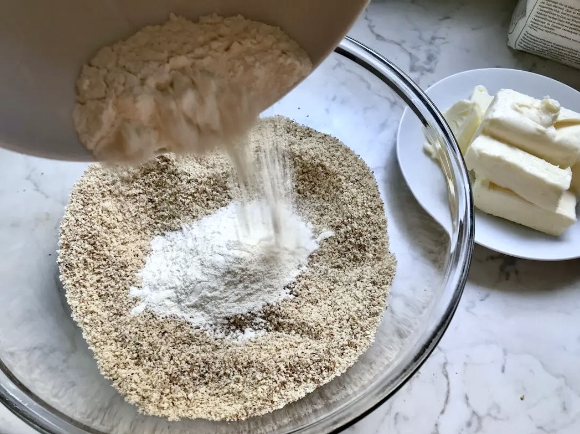 Wsyp do migdałów 50 gramów mąki i wymieszaj. Odstaw na bok.