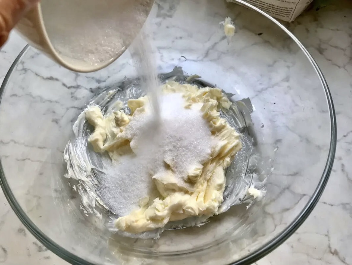 Do osobnej miski przełóż 250 gramów miękkiego masła. Wsyp do niego 100 gramów cukru i miksuj blenderem, aż uzyskasz gładką, jasną masę.