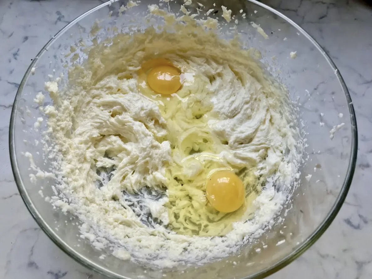 Do masy maślanej wbij 2 całe jajka, dolej odrobinę wanilii i wódkę (jeśli używasz) i miksuj dalej, aż składniki się połączą.