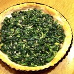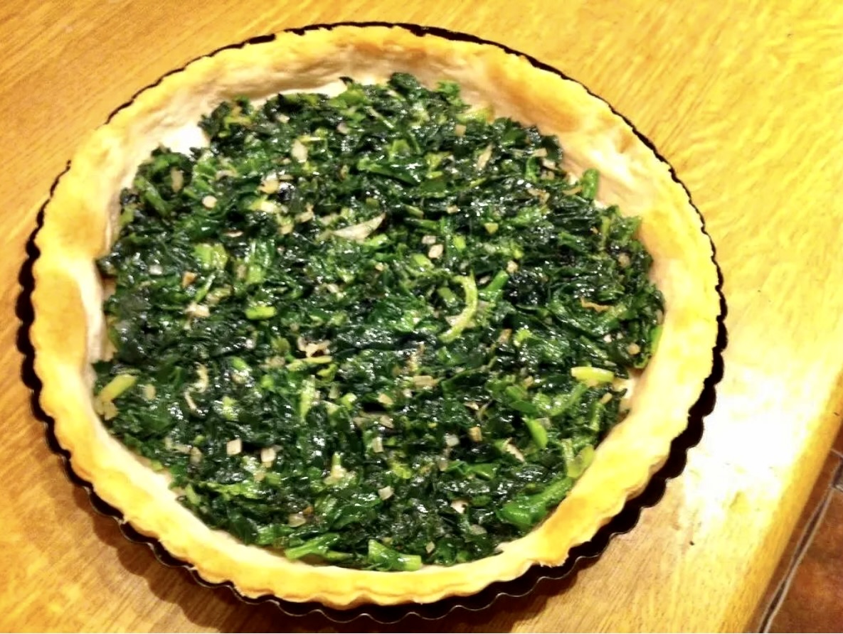 Na podpieczony spód ciasta wyłóż równomiernie szpinak z cebulą.