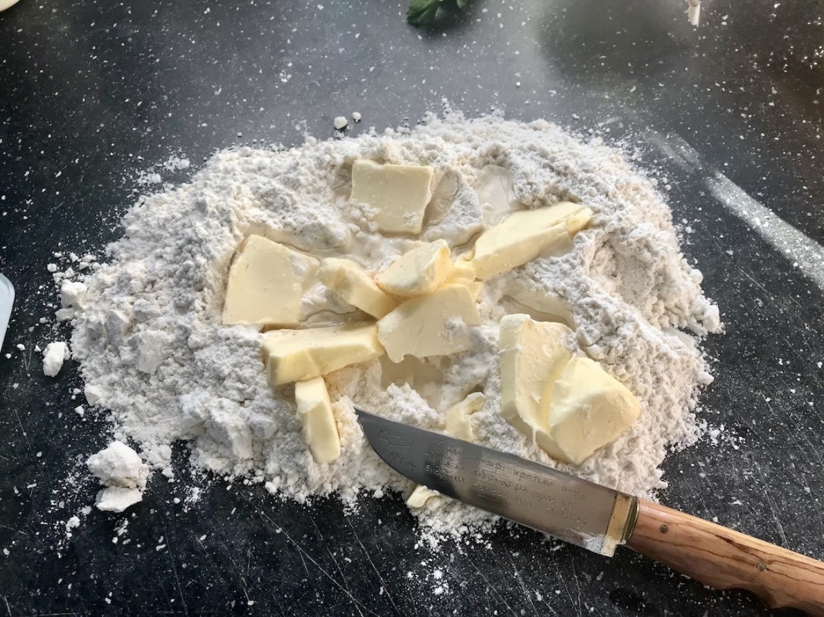Przesiej mąkę na blat, dodaj pokrojone w kostkę zimne masło, szczyptę soli i zimną wodę.