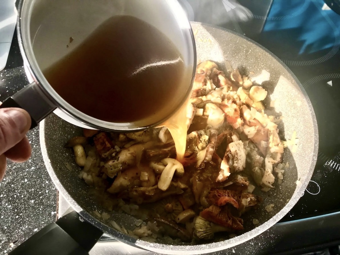 Wlej wywar, a następnie duś grzyby przez około 15 minut, aż płyn całkowicie odparuje.
