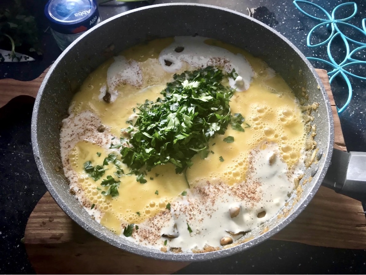 W misce wymieszaj śmietankę z jajkami, gałką muszkatołową i natką pietruszki. Dodaj do tego przestudzone grzyby, a następne wymieszaj wszystko.