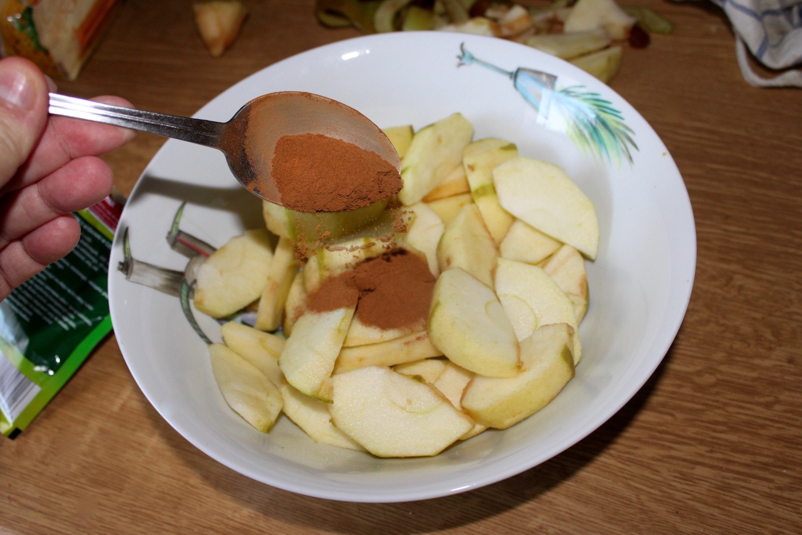 Przygotowanie jabłek: Jabłka umyj, obierz i pozbaw gniazd nasiennych. Pokrój je w ćwiartki lub ósemki. Przełóż do miski, wymieszaj z cynamonem oraz 4 łyżkami cukru.