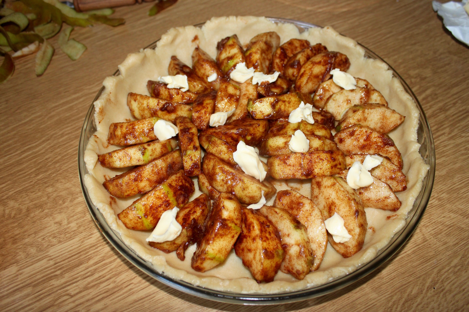 Pieczenie: Na cieście ułóż przygotowane jabłka. Na wierzchu rozłóż kilka drobnych kawałków masła. Piecz w piekarniku nagrzanym do 180°C przez około 40 minut.