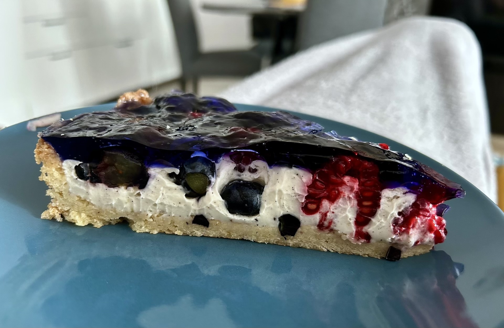 Jest to tarta na kruchym cieście, wypełniona masą z sera mascarpone i śmietanki, a następnie zalana galaretką.