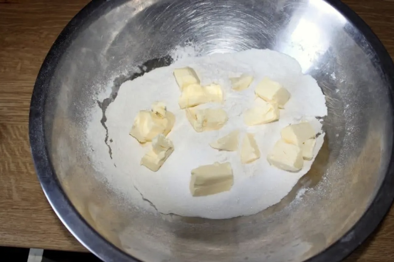 Dodaj 2 łyżki cukru, pół łyżeczki soli oraz pokrojone w małe kostki 125 gramów zimnego masła.
