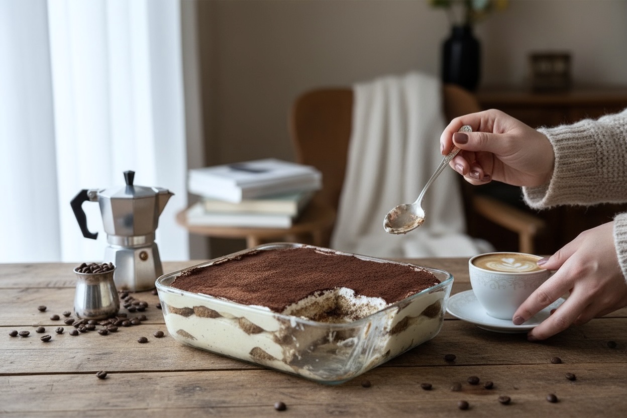 Wstaw Tiramisu do lodówki na całą noc, aby masa stężała, a całość nabrała smaku.