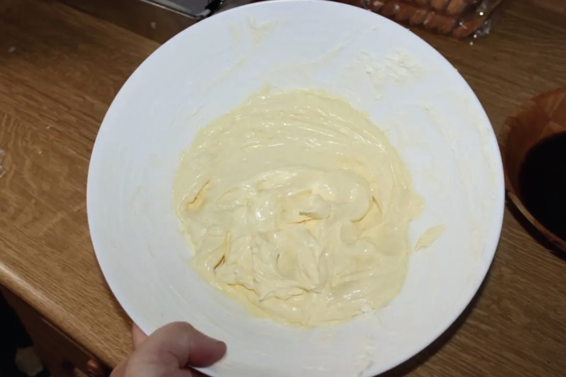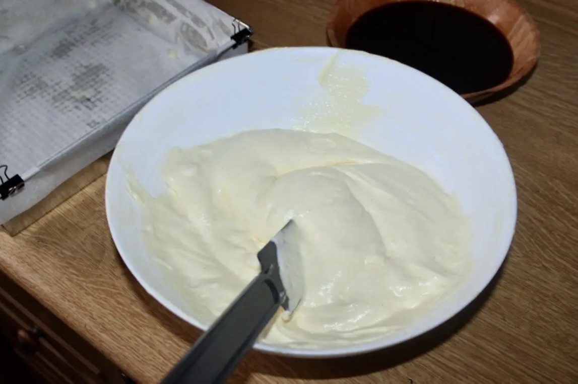 Ubitą pianę z białek dodawaj stopniowo do masy z żółtek i mascarpone, delikatnie mieszając całość, aż powstanie lekka i puszysta masa.