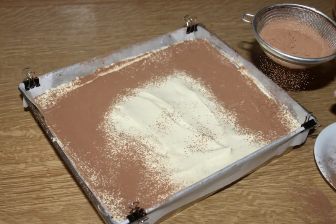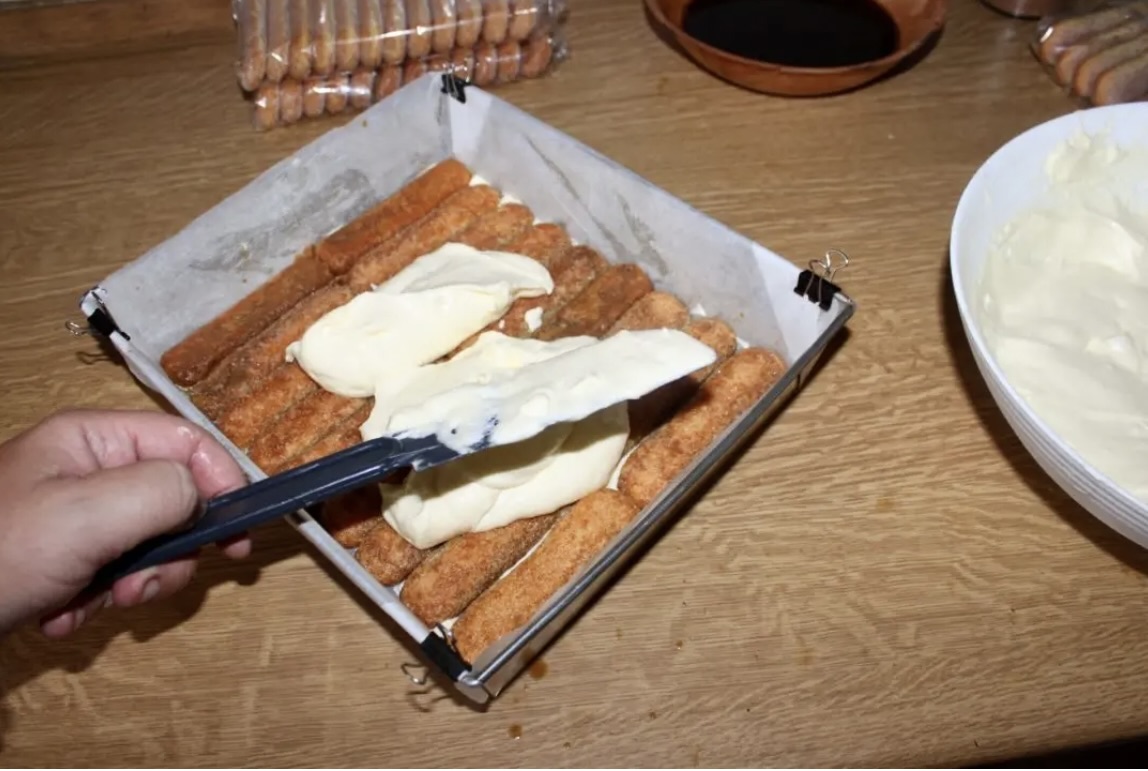 Ułóż w ten sam sposób drugą warstwę biszkoptów nasączonych kawą.